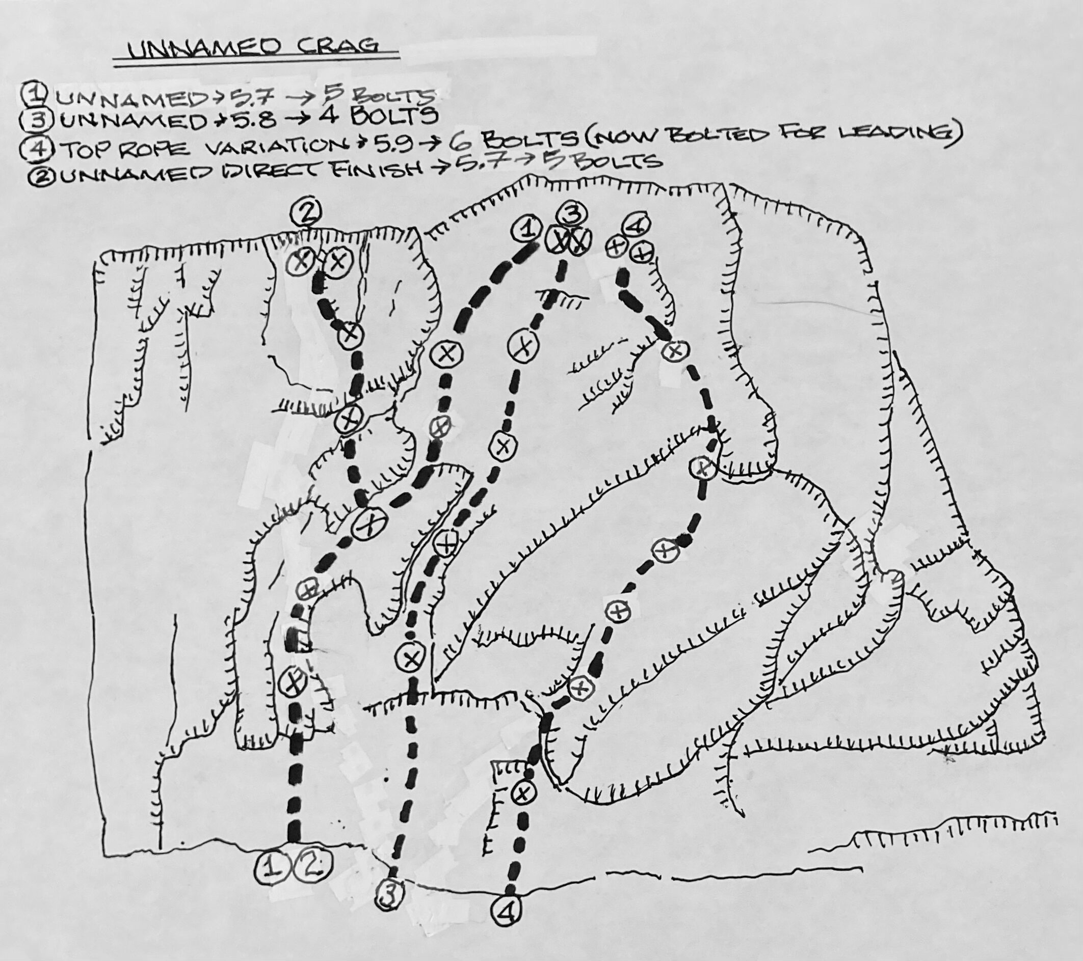 A few years ago we honored Tom Hargis for his singular effort to develop Wilson Canyon. In spite of a cancer diagnosis that would’ve killed most normal folk, he’s still at it, and agreed to let us publish his hand-drawn topos of the crag.